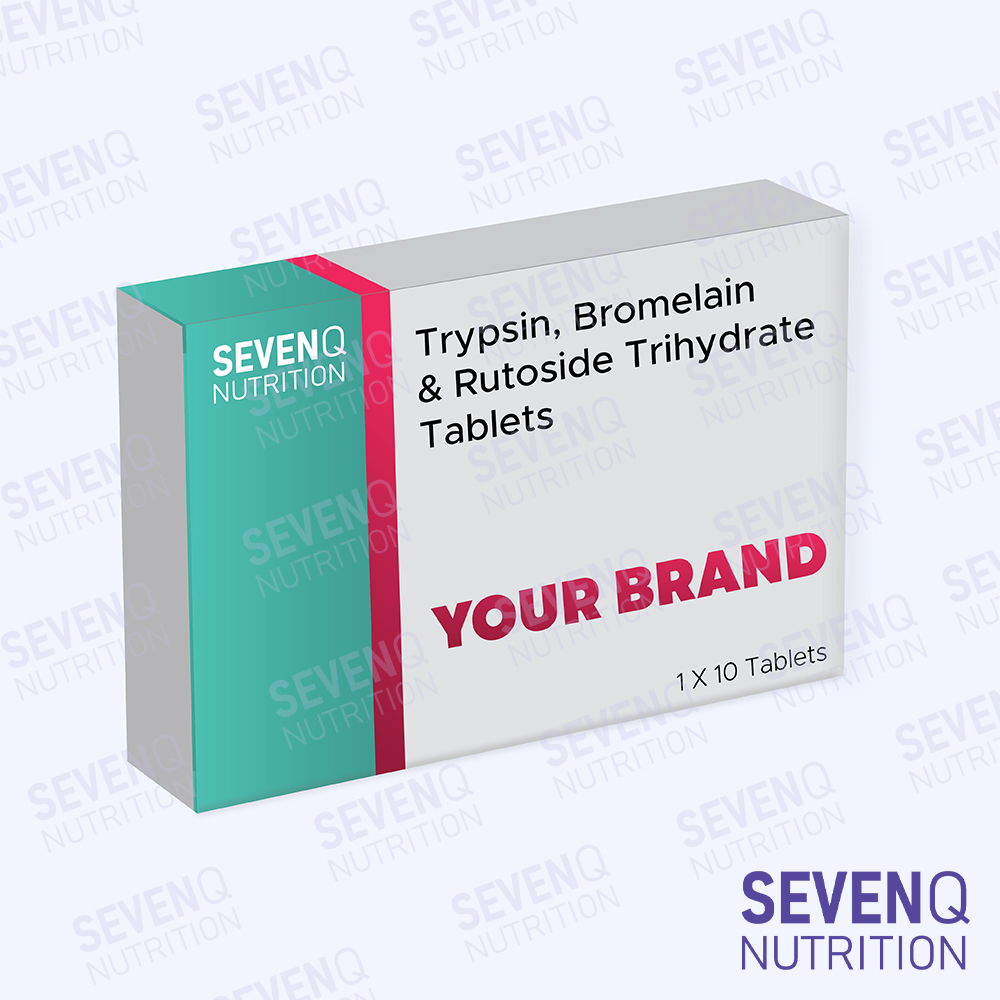 We are contract manufacturer & private label supplier of trypsin bromelain & rutoside trihydrate tablets. Our trypsin tablets contain trypsin, bromelain & rutoside trihydra to support bone wellness. These tablets are formulated for precise dosage, easy swallowing, effective nutrient release & stable formulation making them ideal for daily supplementation. We specialize in private label manufacturing of trypsin bromelain & rutoside trihydrate tablets with custom formulation, dosage strength, packaging and branding options to meet your market needs.